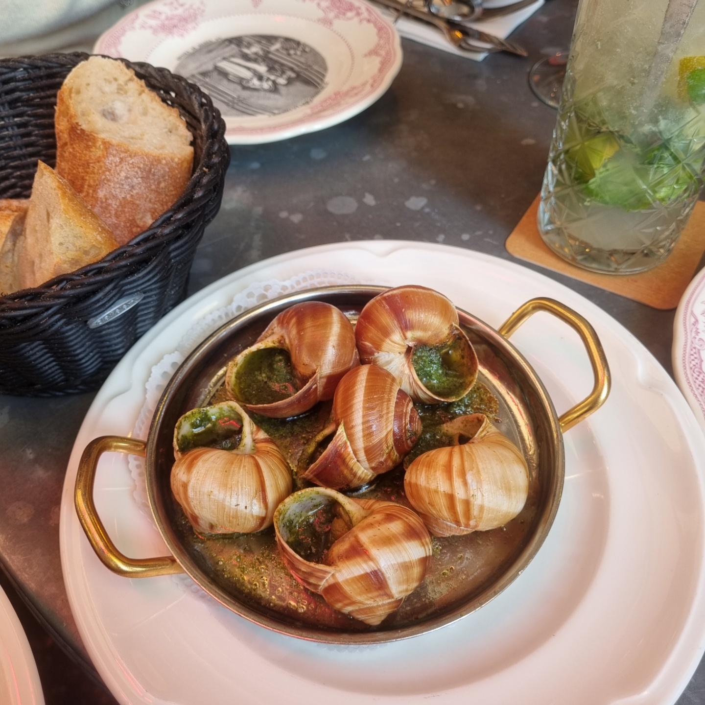 프랑스 요리하면 가장 유명한 것 중 하나가 달팽이 요리, 에스까르고 입니다. 우리나라에서 소라를 즐겨 먹듯이 프랑스에서는 에스까르고를 자주 먹습니다. 하지만 우리나라에서는 흔하지 않은 음식이라서 그런지 저는 한국에서 에스까르고를 먹어본 적이 없었습니다. 그래서 파리에 여행갔을 때 버킷리스트로 정했던 것 중 하나가 파리 본토 레스토랑에서 에스까르고를 먹는 것이었습니다. 그래서 이 레스토랑에 갔을 때 오리 스테이크와 또 하나의 요리로 에스까르고를 주문했습니다. 주문을 하고 음식이 나오니, 매우 큰 달팽이 껍질 6개가 한 접시에 나왔습니다. 껍질이 움직이지 않도록 접시에는 움푹 파인 6개의 자리가 있었습니다.
